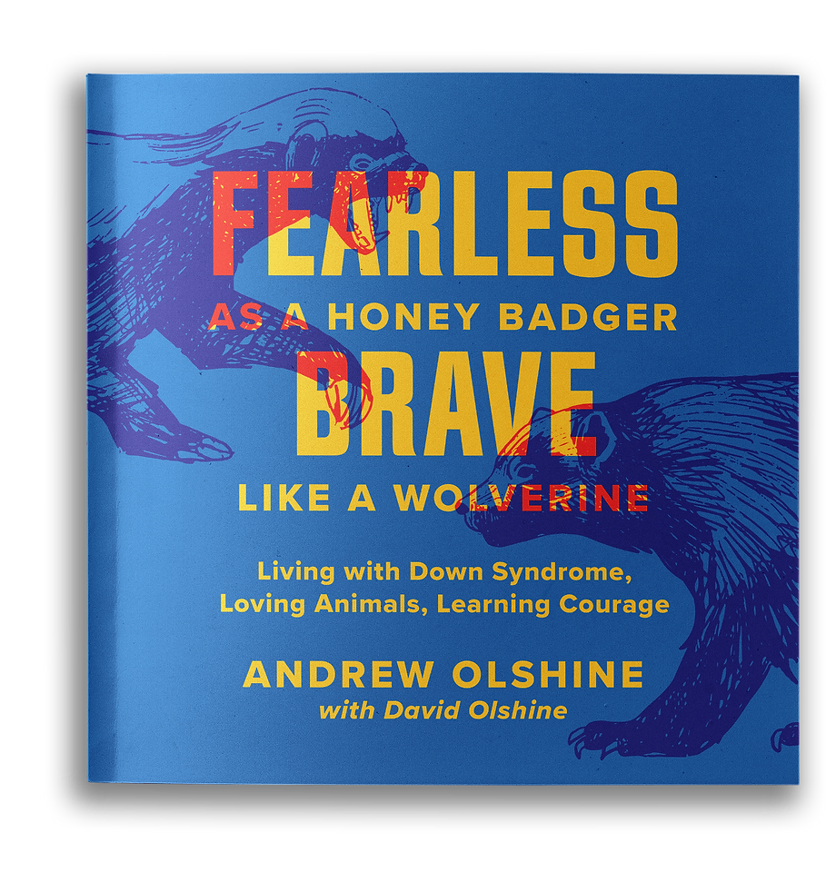 Fearless as a Honey Badger, Brave Like a Wolverine: Living with Down Syndrome, Loving Animals, Learning Courage is an inspirational journal of faith that features photos of over fifty animals. The book is for kids, adults who act like kids (ME!), and anyone who wants to be young again! This fifty-day journey will help you take practical steps in handling the three-headed monster of worry, anxiety, and fear. You will be challenged to live fearless as a honey badger and brave like a wolverine. You can order copies of the book for yourself, your kids, and your grandkids here. Andrew’s cousin Lydia did the cover design of the book. Andrew is currently working on his second title, another book through which God can teach us some spiritual truths through his diverse animal world.