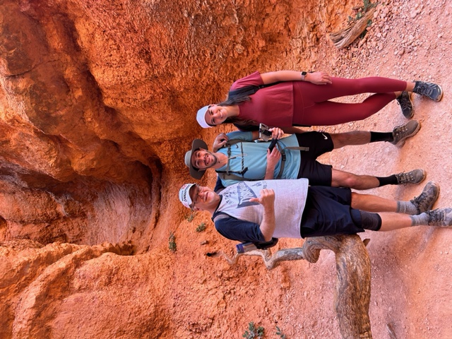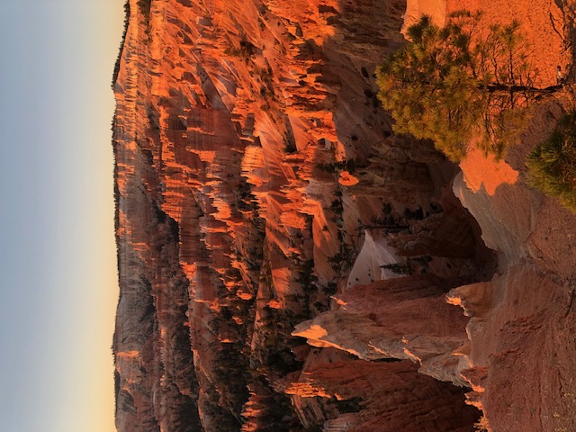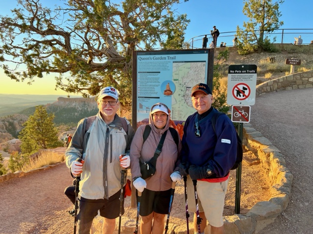 After the spectacular sunrise, Greg, Dee, and I set out on the trail that leads from the rim down into the famous “Queen’s Garden.” We admired the variety of hoodoos, pigments, juniper trees, and Ponderosa pines, along the way until we reached a spot where we were supposed to turn and walk up just a bit to see a hoodoo that resembles Queen Victoria. But if you’re not looking in the right direction, you just might miss it. As we arrived, I said aloud in my best British accent, “God save the Queen,” to which a young woman from Michigan responded, “She’s dead!” We all chuckled, and talked about King Charles and the coming generations of the Royals. But, had we not taken the turn to see “Queen Victoria,” we would have missed this fun encounter with others.